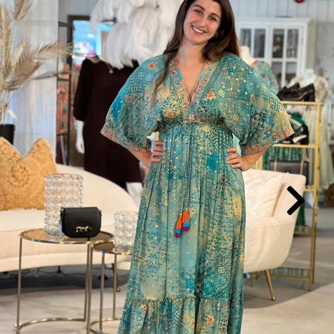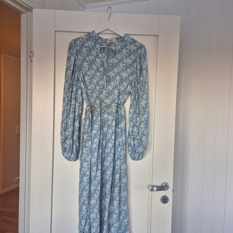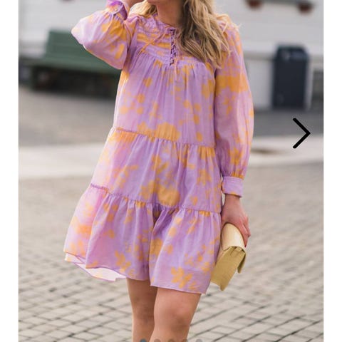 Laget i en blanding av 65% viskose og 35% viskose ECOVERO™, denne kjolen har en løs passform og er designet med korte ermer og elastisk midje. Fargen er gul med blomsterprint, og kjolen har en behagelig lengde. Størrelse S.
