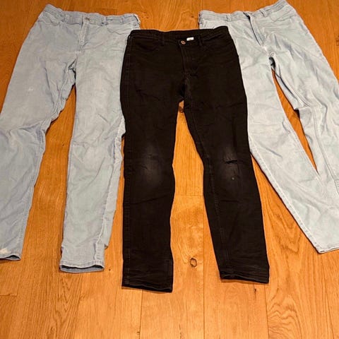 Hvite jeans bukser fra HM, Wide-adjustable waist-high waist. Splitt på utsiden av buksebenene. Brukt 1 gang.