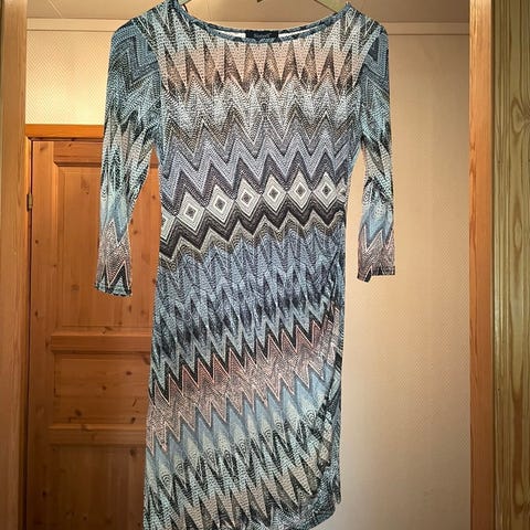 Stilig foldesøm i brystområdet ~ diskret finesse på kjolen. Fint sikk sakk mønster i Missoni stil i fargene sort, hvit og lysebrunt