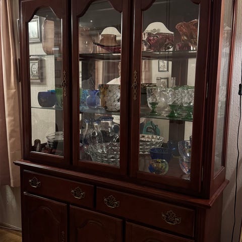 Komplett Elizabeth spisestue i heltre bjørk, som består av fremskap, skjenk, spisebord og 10 stoler. Selges helst samlet. Alt er veldig pent brukt, med få/ingen bruksmerker. Bordet har dessverre et par «varmemerker», men plata kan enkelt pusses. 2 stk innleggsplater a 45 cm oppbevares under bordplaten. Bordet er 2 meter langt uten ileggsplatene. Se bilde 2 for mål på møblene.