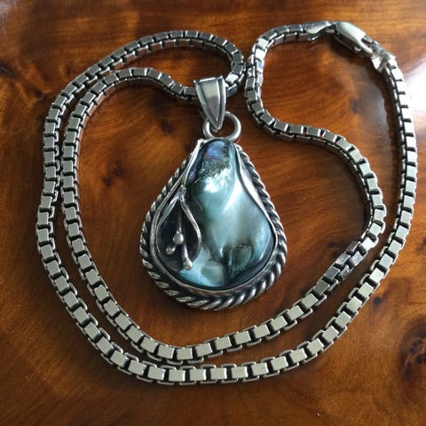 Et vakkert halskjede med Abaloneskjell (19 stk, ca 25 x 15 mm). L=46 cm.
