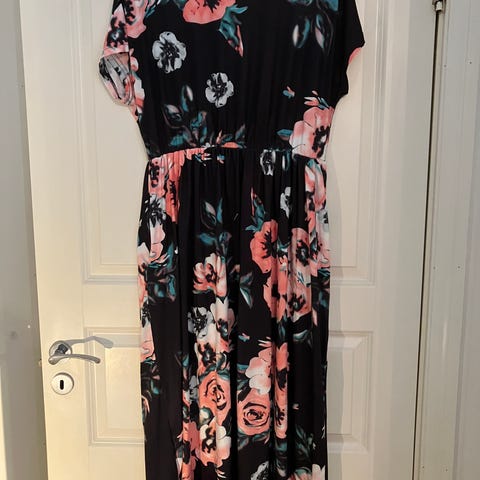 Selger ny kjole med rosa overdel med strikk nederst i ermene og mørk blå blomstret fôret mesh nederdel fra Body Flirt for 250 kr.