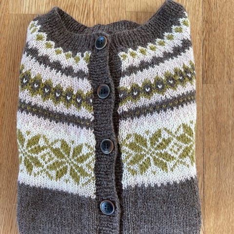Hjemmestrikket og ubrukt Nancygenser i grønn og beige strikket med Sandnes mini-alpakka garn. Ca str L.