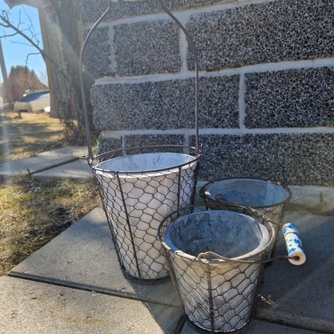 3 stk blomsterpotter i stativ for salg. De er av blekk/ metall. De er sammenhengende, men kan vris på forskjellig vis.