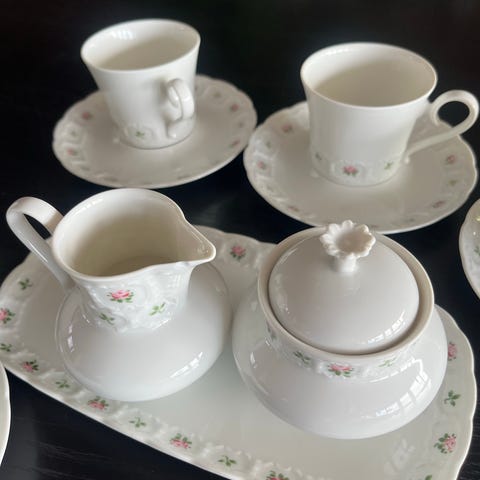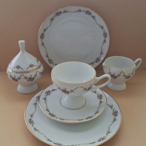 Kaffeservise består av 8 kaffekopper, 10 skåler og 12 asjetter/kake. Fruktservise består av kakefat og 6 asjetter.