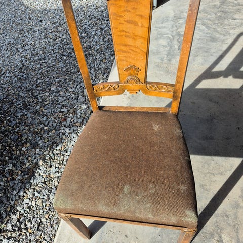 Gammel stol med litt slitt original ull trekk selges for 300kr