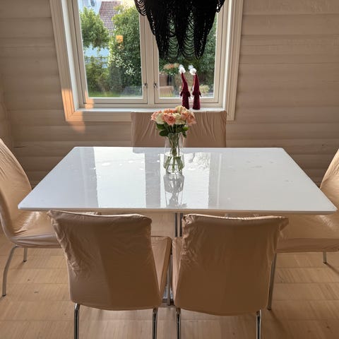 Pent brukt, men er noen flekker på stolene og noen på bordet. Kan være flekkene på bordet går bort om man oljer det på nytt.