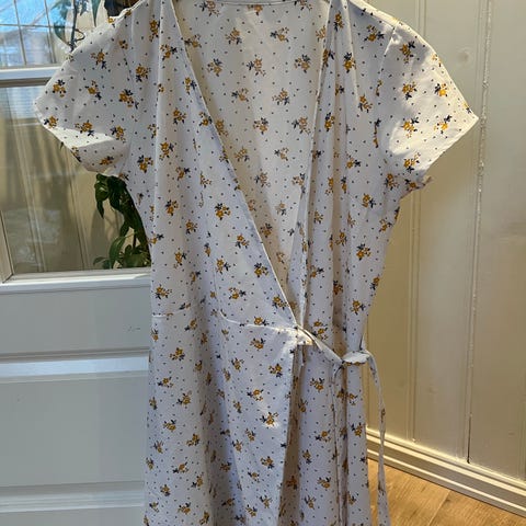 Praktisk talt ny og søt wrap kjole i str XS (passer også en str S) perfekte for varme sommerkvelder eller sommerdager. Ermene er tidløse og kjolen har et nydelig mønster. Kun brukt 1 gang.
