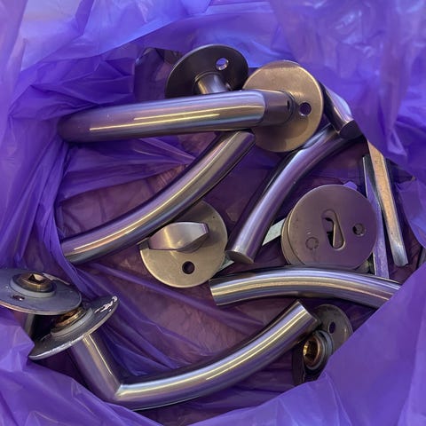 Nye flotte dørhåndtak, med skjulte skruer. Følger med skruer og det som trengs. Ta kontakt med antallet du trenger. Kan gi bedre pris ved kjøp av flere. Kan kreve modifikasjoner på noen dører. 10stk 500kr