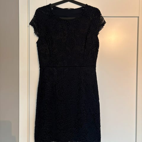 Selger en kjempefin svart blondekjole fra H&M (merket Divided). Kjolen har et tidløst design med korte ermer, rund hals og pene detaljer i blondene. Den har en dekorativ glidelås i ryggen som gjør den enkel å ta av og på.