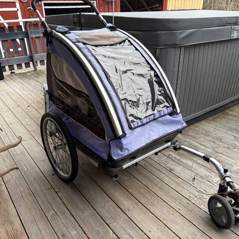 Selges med myggnetting, 2 stk regntrekk, solskjerming, feste til sykkel og 2 hjul, sånn at den også kan brukes som vanlig vogn. De 2 hjulene kan også festes på vognen når den brukes som sykkelvogn. Fint om man plutselig skal inn et sted og ungen fortsatt vil sitte i vognen.