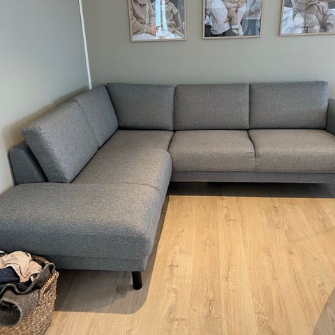 Sofa med sjeselong selges. Pent brukt. Fra Devine-serien til Fagmøbler. Mørk grå farge og bein i ubehandlet eik. Nypris: 17 195,-