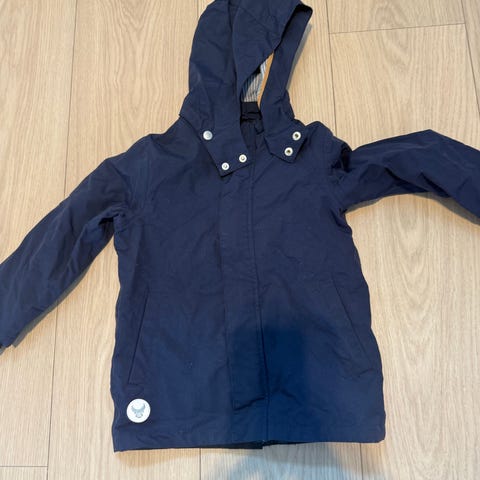 Veldig pent brukt jakke fra det danske klesmerket DWG, modell Viktor, str 12 år. Jakken er marineblå bomull og polyester med hvit detalj på glidelås. Jakken er foret med et polyesterstoff. Hetten er med snøring og er avtagbar. To lommer i front.