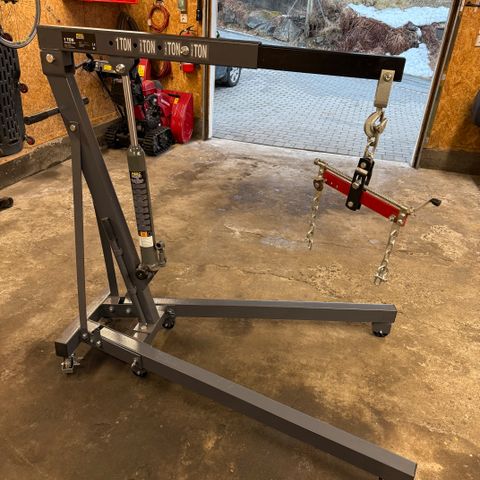 1000 kg hydraulisk kran for å løfte motorer. Vribar løftekrok og uttrekkbar løftearm for 4 alternative løfteposisjoner med ulik maks. belastning.