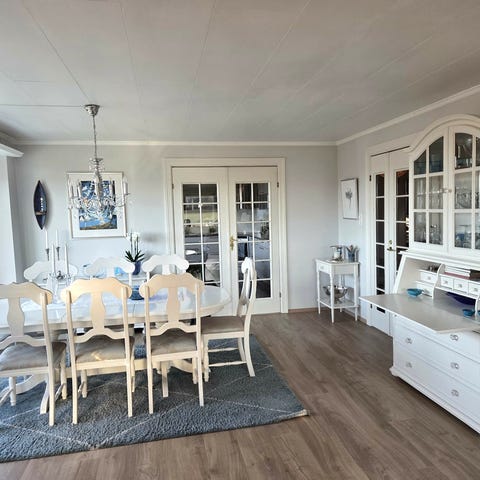 Spisestue med skjenk, vitrineskap, spisebord og seks stoler i lik utførelse.