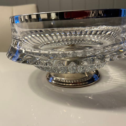 Vintage krystallskålen er arvet. Den er oppbevart og brukt meget pent og forsiktig i mange mange år og har ingen skader, kun minimale bitte små ripemerker som nesten ikke synes og vanskelig å se.