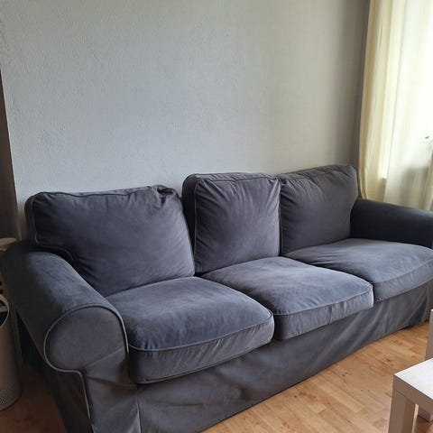 Selger et trekk i en nydelig grønnblå farge fra SofaCompany til sofa-modellen Henry. Det er kjøpt brukt, så jeg er usikker på hva det er laget av, men kjennes ut som ull.