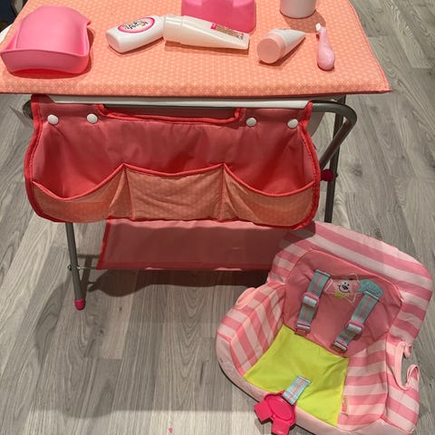 Selger HABA sminkebord med stol (Dukkestr, passer f.eks.Babyborn). babyborn toalett med artige lyder. Nesten ikke lekt med, da vi ikke har hatt plass til å ha det fremme.