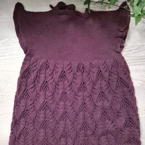 Hjemmestrikket ny Terne kjole, størrelse 1 1/2 - 2 år, strikket i rosa tynn merino fra Drops garn, treknapp i nakken, glattstrikk i bærestykke, mønsterstrikk i skjørtdelen.