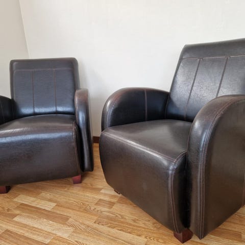 Skinnet har blitt veldig kult med tiden- mykt og former seg fint i stolen. Men «trådene» rundt har fått litt skader. Vi syntes det gir stolen et røft uttrykk, men det er sikkert mulig å fikse den litt eller evt få tak i nye reimer. Selges som den er. Kom med seriøst bud om du ikke er enig i prisen