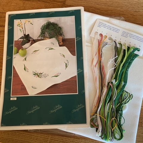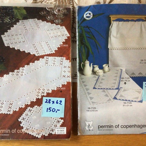 Uåpnet broderipakke med påtegnet duk (90•90 cm), 5 dukker blått dmc-broderigarn og blonder til å sy på kantene rundt. Stoffet er 50 % bomull og 50 % lin.