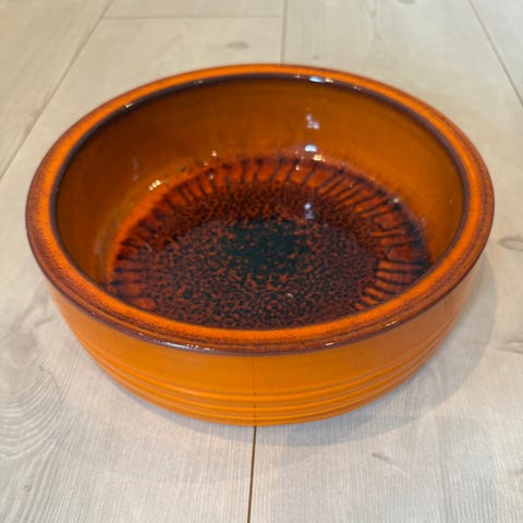 Selger ei gammel fin skål i nydelig farge. Usikker på om den er ildfast. Diameter 18,5 cm, høyde ca 7 cm.