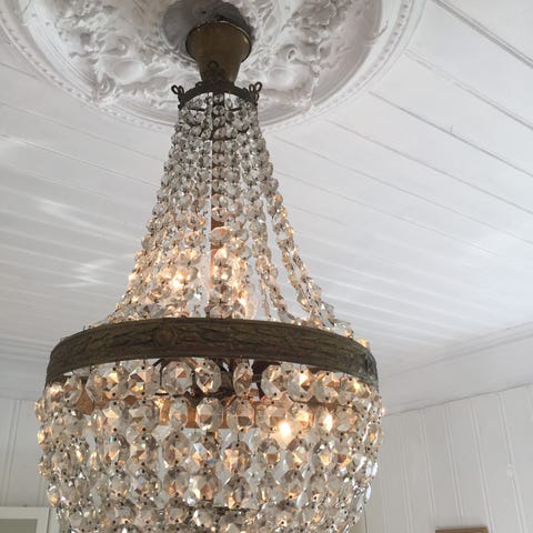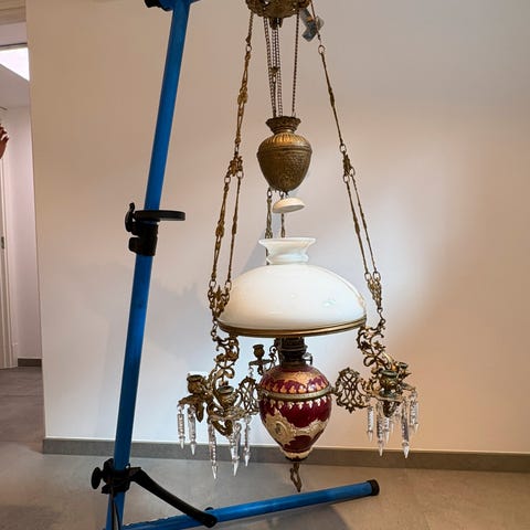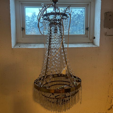 Antikk lampe med blyinnfelte uslipte glassbiter.