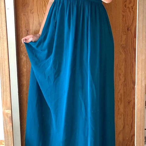 Lang nydelig stroppeløs kjole. Fin farge og faller pent.