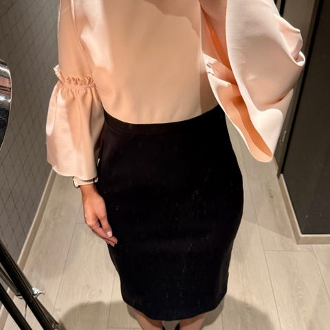 Nydelig dekor med sorte «perler» langs utringning og liv. Delikat utringning bak med sløyfe-knyting med chiffon-stoffet. En virkelig lekker kjole. Kommer dessverre ikke like godt frem på bildene. Nydelig farge, som skimtes litt gjennom den sorte chiffon som er over.
