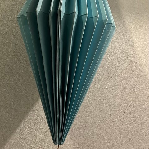 Pent brukte papir origami hengende «pyntekuler». Sammenleggbare og «festes» med magneter. Gjenbrukbare og kan lett oppbevares når ikke i bruk 🎱