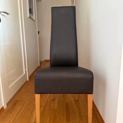 Seks stk lekre Spisestuestoler i ekte kvalitet, håndlaget i sort skinn.