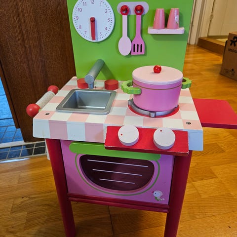 Selger en pen brukt leke handlekurv med noe lekemat i “boks” + noe lekeklosser