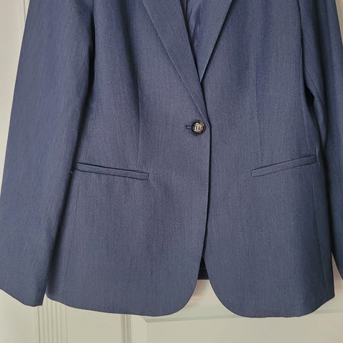 Lys blå, kort blazer/dressjakke sydd av en skredder i Thailand. Aldri brukt, men vasket en gang. Jeg TROR dette er ekte silke! Størrelsen vil nok tilsvare en L eller en M. Jakken er innsvingt, har lommer og tre knapper foran og skulderputer. Ca mål: arm fra skulder: 54 cm, underarm: 36 cm, lengde fra nakken: 51,5 cm, bredde foran under armene: 46 cm, livvidde: 80 cm. Jeg har flere plagg av samme stoff; se siste bilder, og jeg kan evt lage en pakkepris 😊