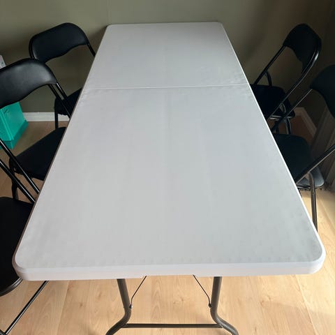 Klappbord og klappstoler til utleie. 4 hvite bord og 30 svarte stoler tilgjengelig.