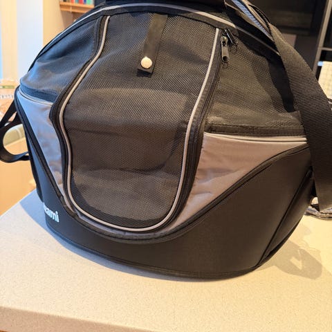 En slitesterk og ventilert oval hunde-/katteveske som er både komfortabel og fin. Den er enkel å komme inn og ut av med flere muligheter for åpninger. Transportvesken har to sidelommer man kan ha bånd eller reiseskål i for eksempel. Og den har et innebygd bånd som forhindrer at hunden/katten hopper ut. Om man ønsker kan hele toppen tas av, og vesken kan brukes som kurv. Pute i bånn og for på siden kan og tas av for lettere rengjøring.