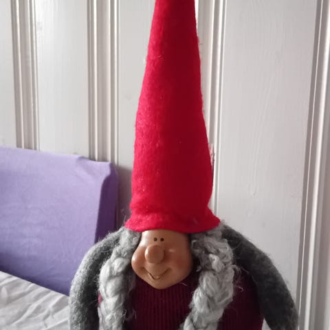 Nisse som er strikket til evt ha over flasker eller kan den stå for seg selv med en dorull inni.