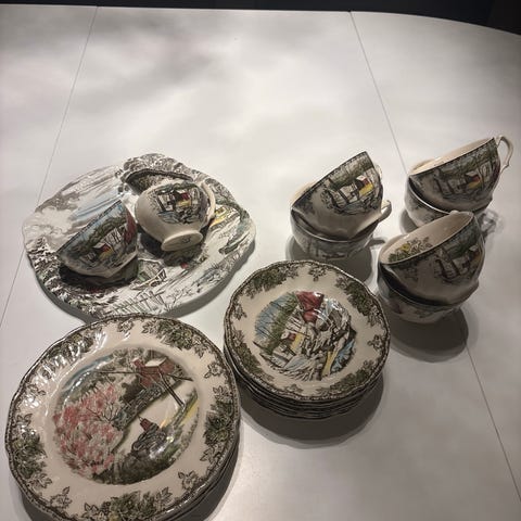 6 stk. kopper m/skål og 8 stk. asjetter. Svært lite brukt, kun 1 stk. kopp har krakelering. Ellers veldig fine.