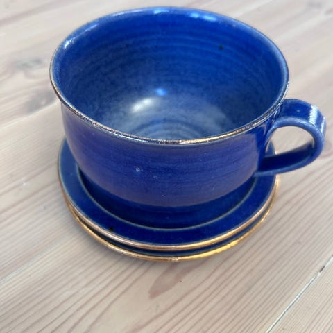 9 kopper og 9 skåler selges samlet 500kr. Lannem keramikk service i dyp blå farge.