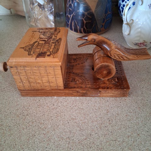Fin vintage gammel tobakkeske med nattevaken dekor på lokket. Hel og fin for oppbevaring til smykke, nøkler eller gi den i gave. Hentes i Halden eller kan sendes med Fiks ferdig Helthjem.