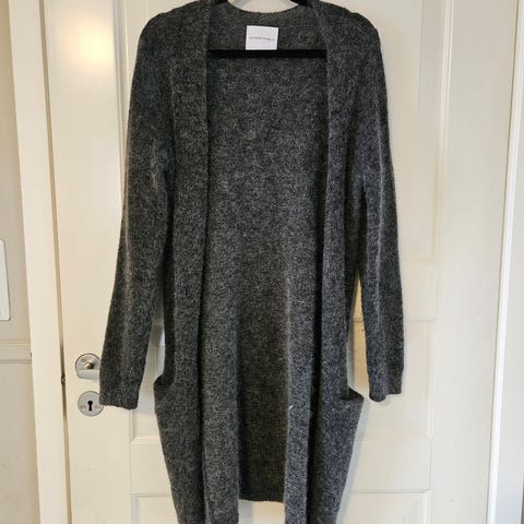 Pent brukt grå strikket jakke fra SuperDry. Lang (rekker til knærne sånn ca) og med to lommer