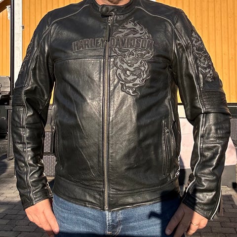MC fritidsjakke selges billig for kr.250,- Jakken er omtrent fortsatt å anse som nesten ny da den har kun blitt brukt 2 ganger av meg selv siden jeg kjøpte den NY utenlands for noen år tilbake, denne jakken er i størrelse Large (L) ja, den har dessverre blitt hengende i garderobeskapet mitt her i for lang tid, mye pga. jeg uten tvil har hatt og fortsatt har for mange jakker i nogenlunde samme sjanger å da har jeg dessverre glemt mye opp gjennom siste årene nå etter jeg kjøpte den helt ny i butikk utenlands å bruke den slik jeg hadde planlagt å ønsket. Jakken viser seg nå dessverre ikke lenger passe i størrelsen for meg, jeg har dessverre gått noe opp i vekt i senere tid å da viser det seg nå at jakken blir for trang for meg å ha på…. dette var veldig synd syntes jeg siden denne jakken er veldig stilig og også veldig god i utgangspunktet å ha på seg. Derfor velger jeg nå dessverre å heller selge denne til en denne passer merkbart bedre i størrelsen på en meg.