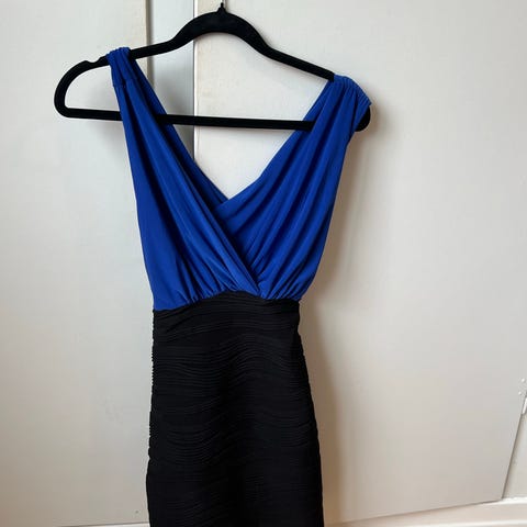 Selger en kort og kroppsnær kjole fra Sisters Point i str S. Den er sort nederst og blå øverst. Skulderstroppene er festet i kryss bak, og de kan skyves ned over skuldrene om man ønsker det, eller ha stroppene mer rett opp. Den er moderat brukt med få bruksmerker. Se bilder for nærmere detaljer.
