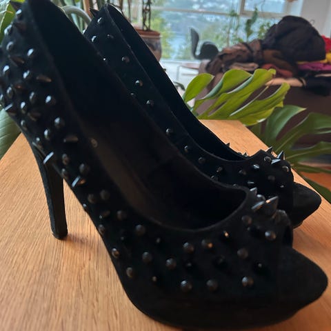 Brukt en gang på halloween / kostyme fest med nagler. Det er laget i stoff og det er støv på de, de er svart med nagler i fløyel lignende stoff.