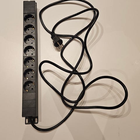 Praktisk forgrener som enkelt kan festes på skrivebordet slik at du får to stikkontakter lett tilgjengelig. Hullet er for f.eks. USB-ledning eller annet. Jeg har flere. Ca 1,5 m ledning fra denne til stikkontakt. Passer for de fleste typer skrivebord/bord, også hev/senk. Komplett med bordfeste.