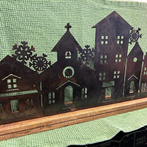 Pyntegjenstand med motiv av hus, hav, blomster (Ståend