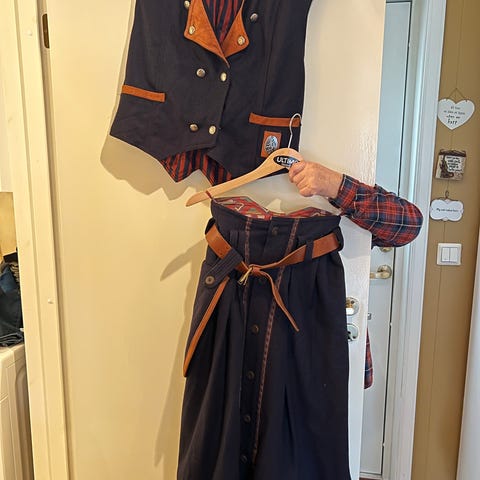 Komplett drakt: Skjørt med lærbelte og veske. Jakke, vest og skjorte. Størrelse Large. Drakta er ikke slitt.