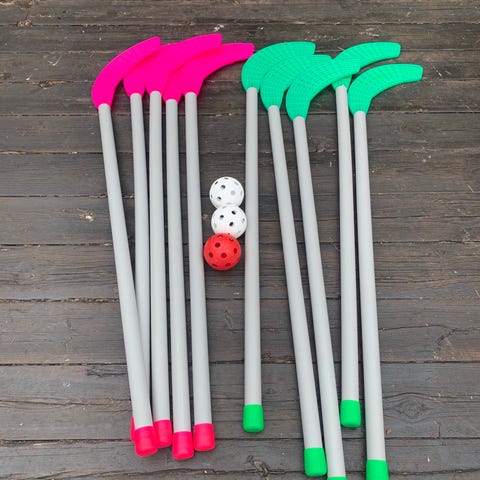Dette tradisjonelle krokketsettet er egnet for 4 spillere, og er perfekt for å spille i hagen eller på stranden. Laget av solid furu, er settet solid og sterkt for flere år med moro. Dette utendørs spillet er moro og engasjerende for spillere i alle aldre (alderen 3+). Leveransen inkluderer 4 stripete treklubber, 4 fargede baller, 2 stripete knagger og 10 ringer.