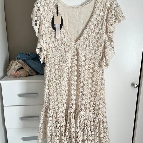 Nydelig lang heklet kjole, str 36/38.