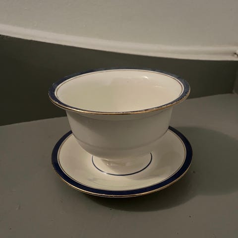 Kopp og tallerken sett med blått mønster fra Whilhelmsen rederi. Prisen er for hvert. sett