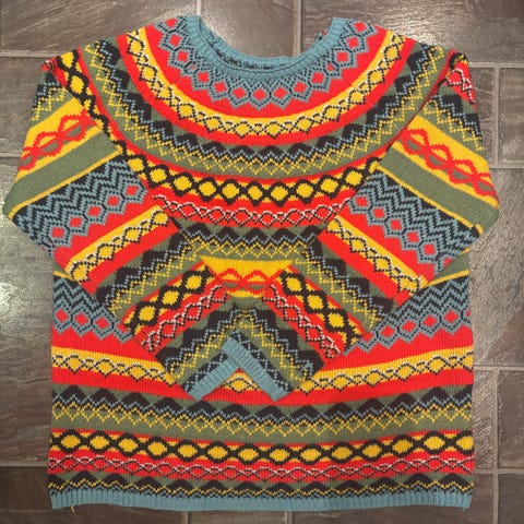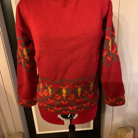 Retro hjemmestrikket bomullsgenser. Strikket på 90-tallet en gang. Usikker på størrelse, men lengde ca 65 cm, vidde ca 55 og armlengde ca 48 cm.